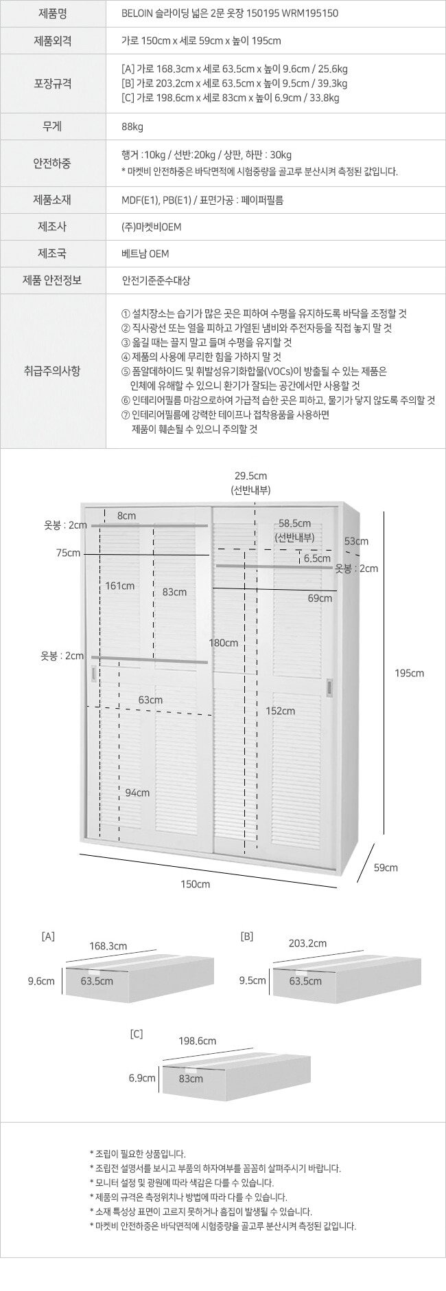 [마켓비] 벨로인 슬라이딩 넓은 2문 옷장 150195 WRM195150