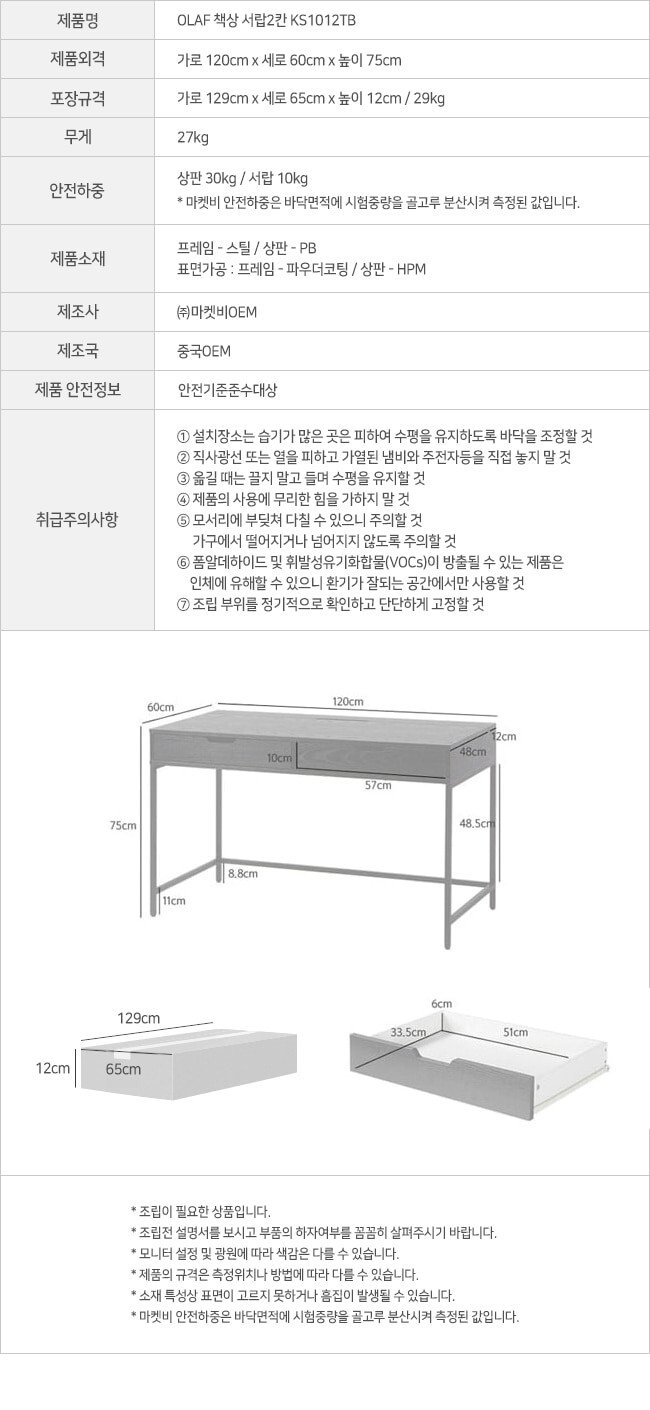 [마켓비] OLAF 책상 서랍2칸 KS1012TB