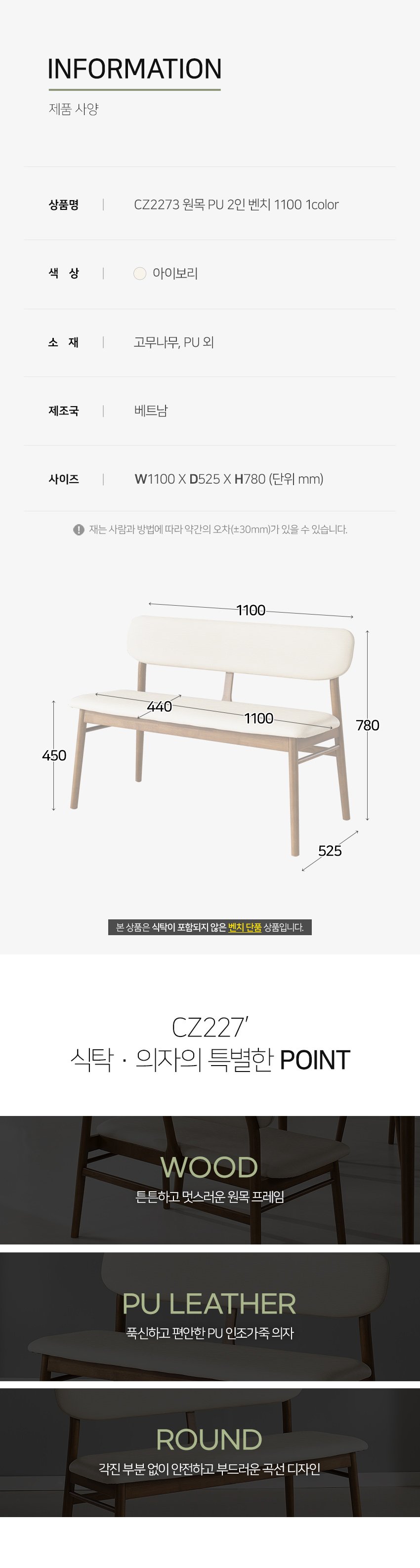 [히트가구] CZ2273 원목 PU 2인 벤치 1100 1color
