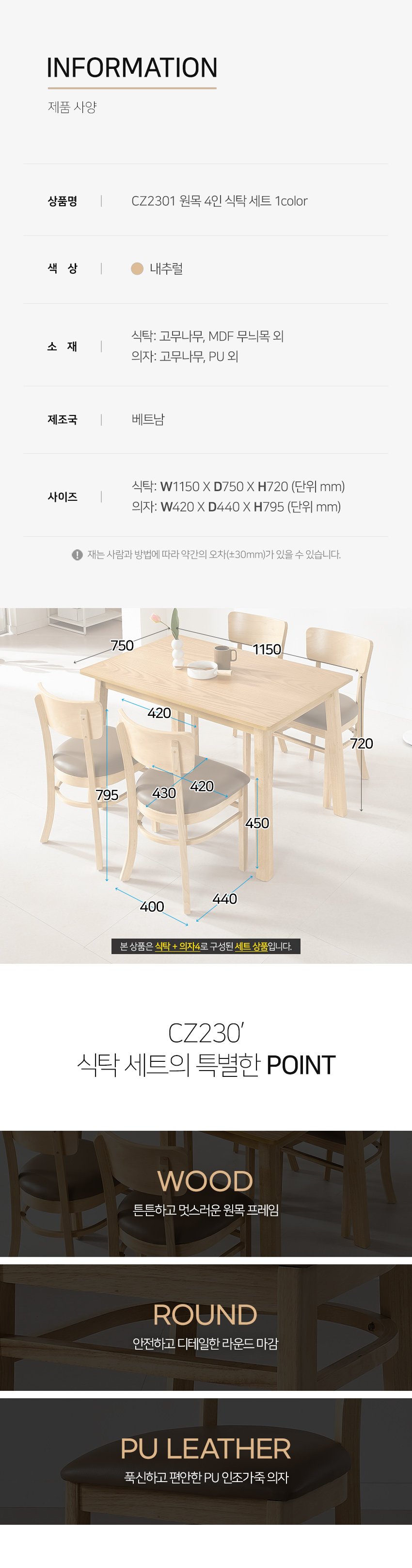 [히트가구] CZ2301 원목 4인 식탁 세트 1color