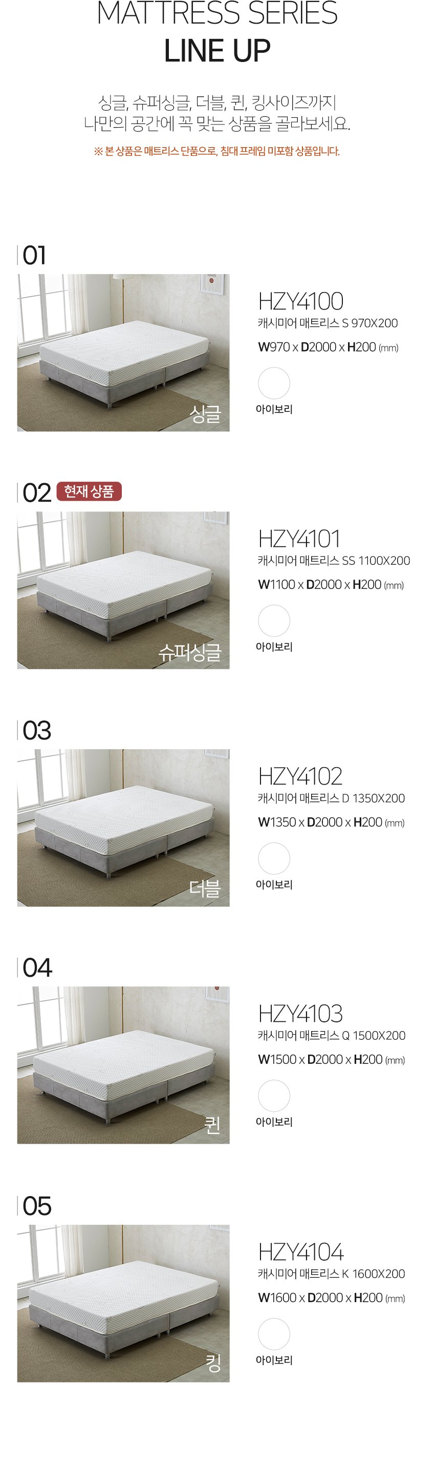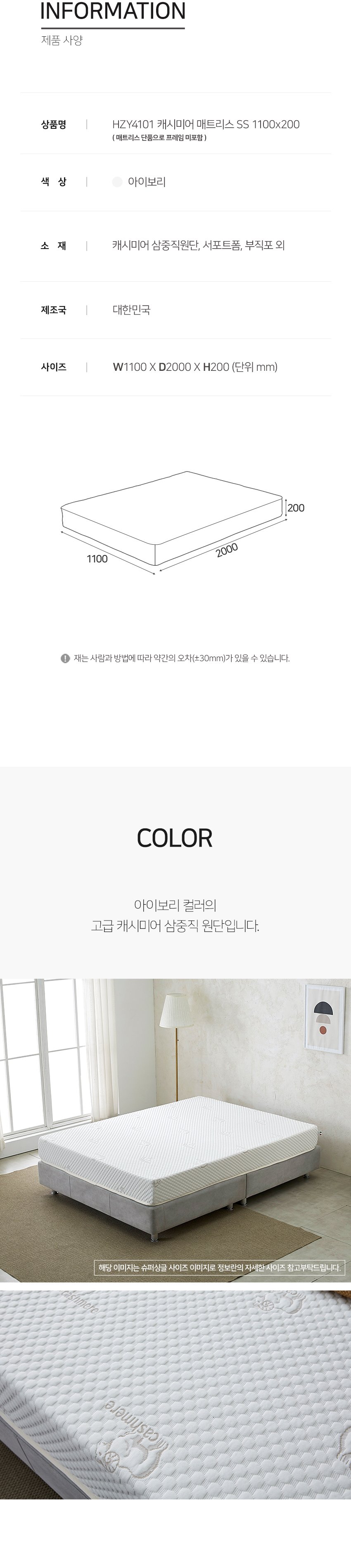 [히트가구] HZY4101 캐시미어 매트리스 SS 1100×200