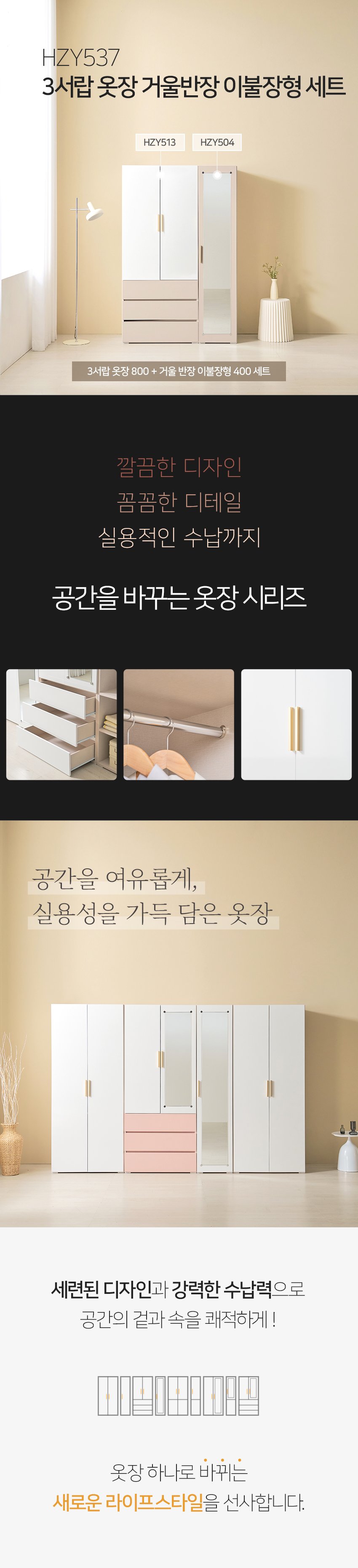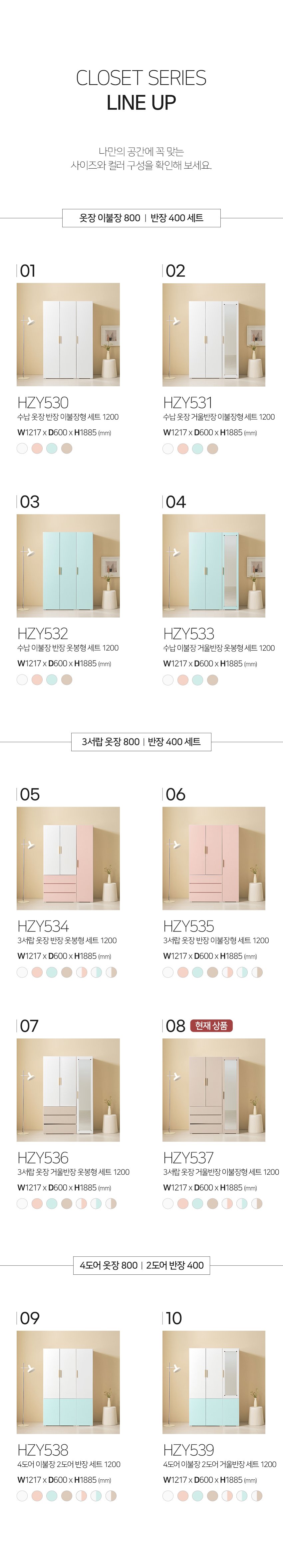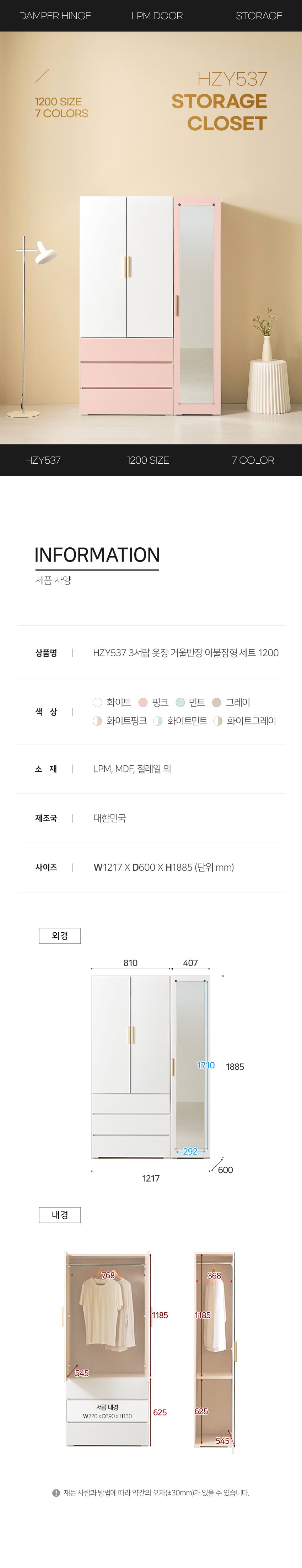 [히트가구] HZY537 3서랍 옷장 거울반장 이불장형 세트 1200