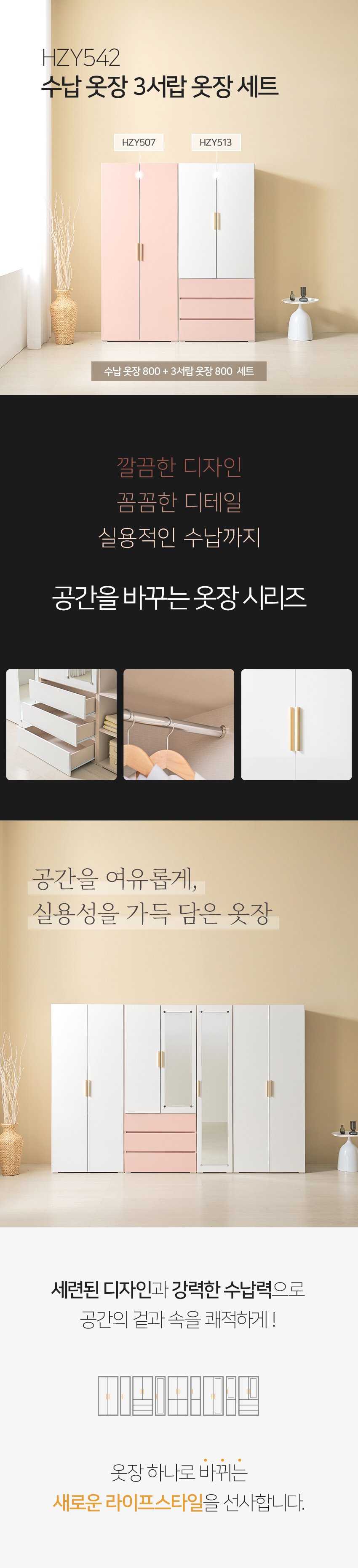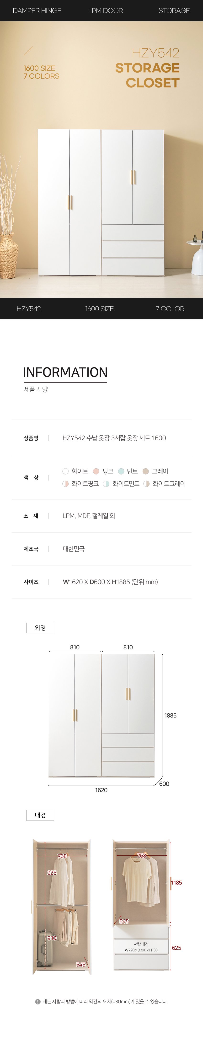 [히트가구] HZY542 수납 옷장 3서랍 옷장 세트 1600