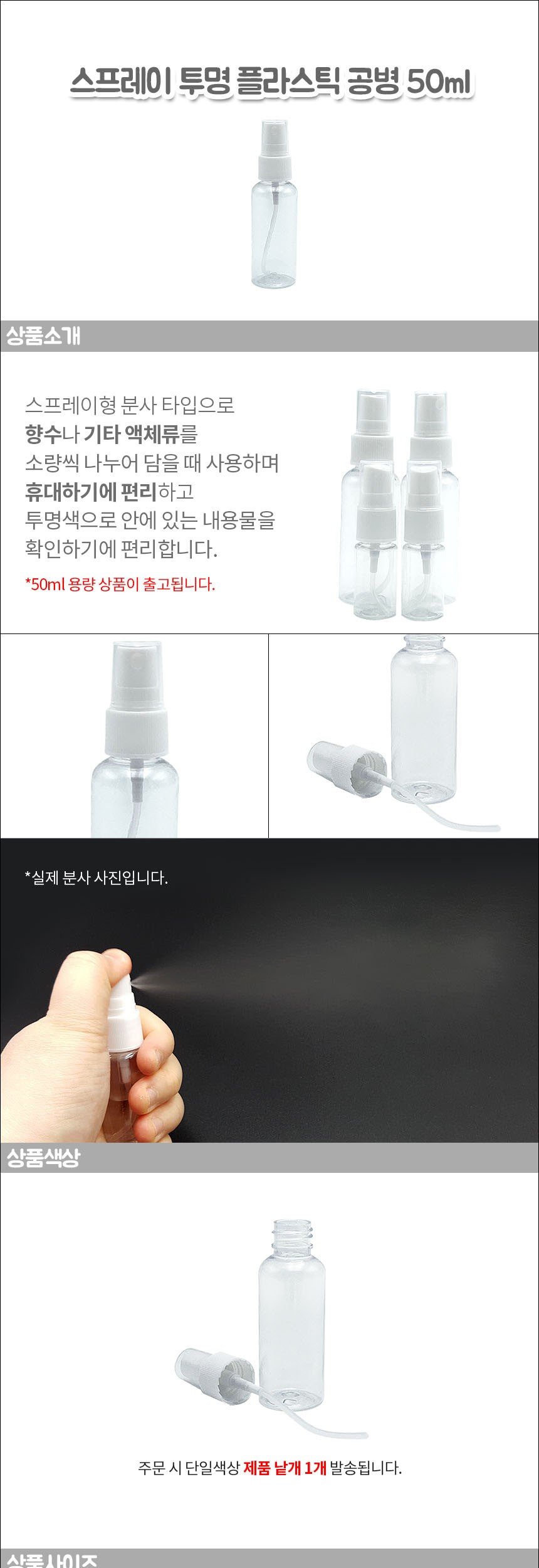 [RS물산] 스프레이 투명 플라스틱 공병 50ml 소분 용기 향수 미스트 여행 휴대용